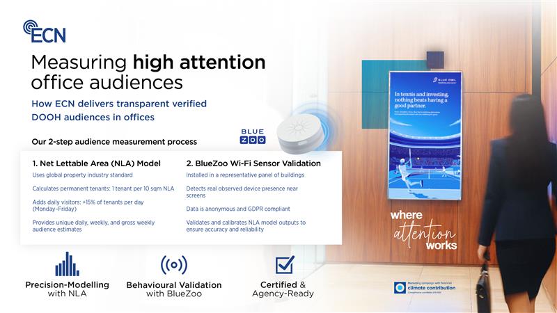 ECN’s methodology turns office-based DOOH into a fully accountable, impression-based medium, one that speaks the same language as online video, connected TV, and digital display.